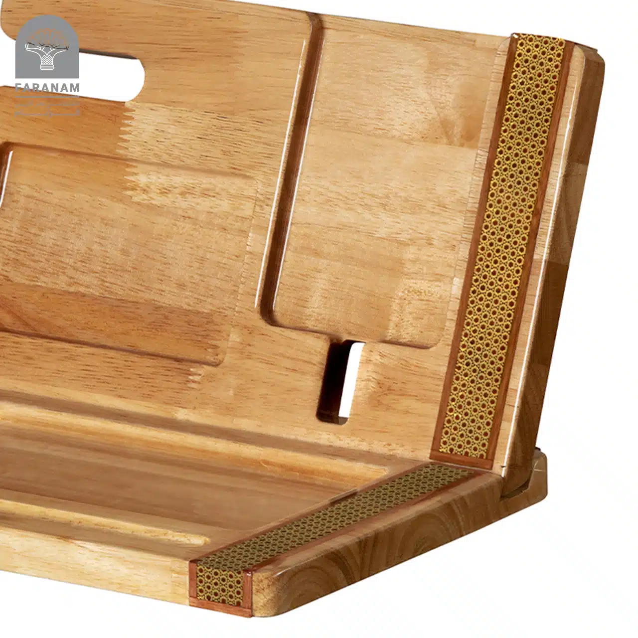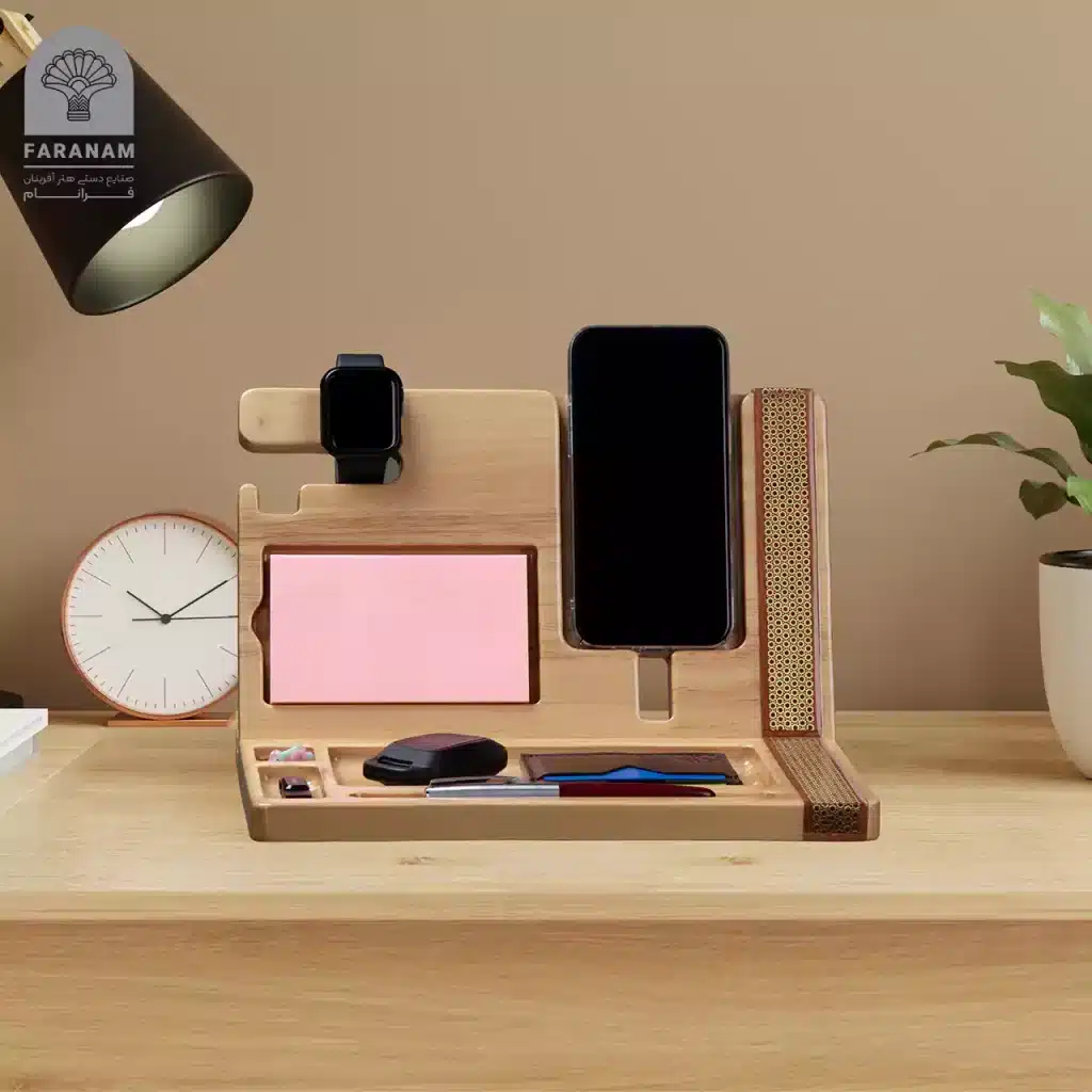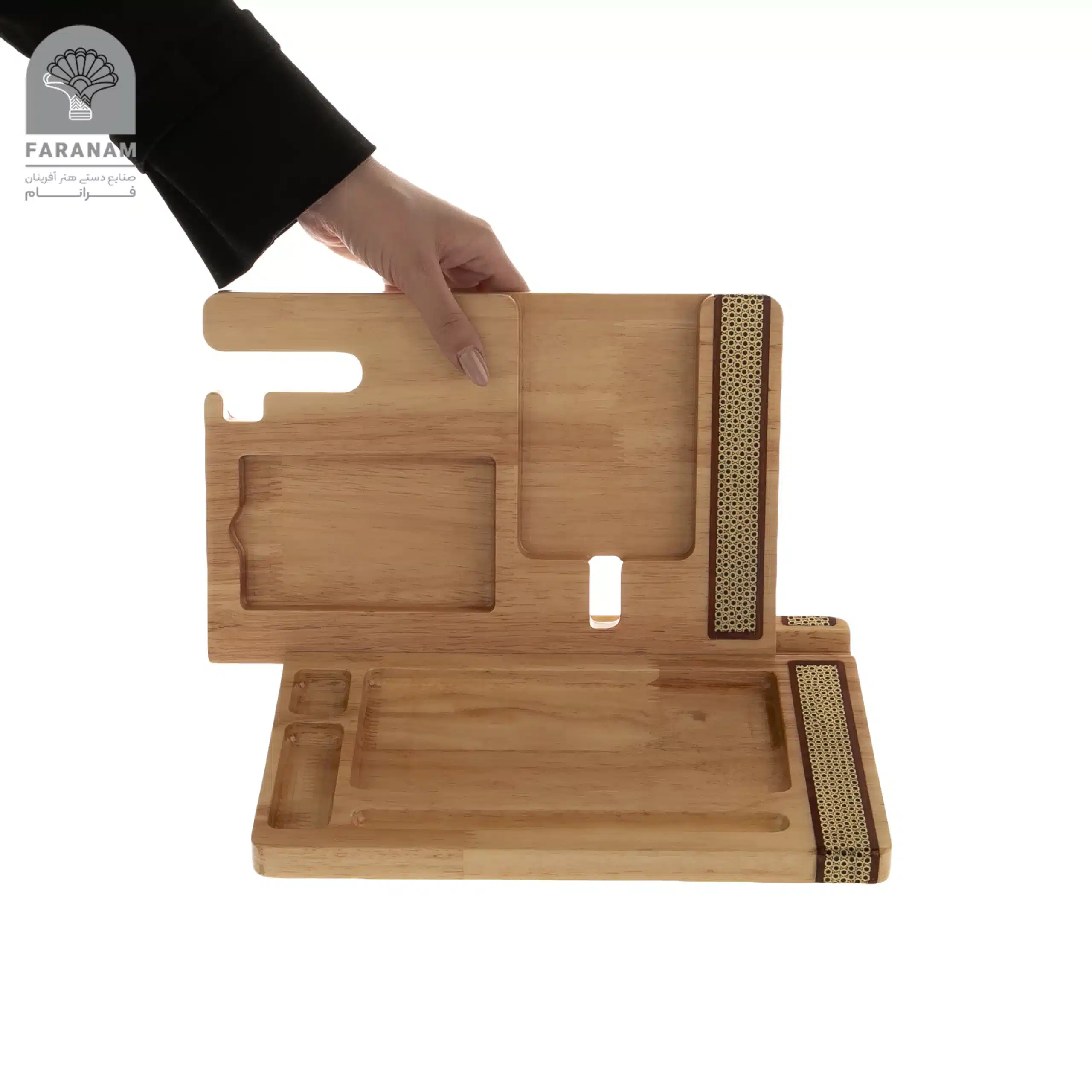استندهای نظم دهنده فرانام از چوب رابروود خالص میباشد که با ابعاد 21.30.4 و وزن تقریبی 1154 گرم با هنر زیبا و فاخر صنایع دستی اعم از خاتم، تذهیب و گل و مرغ مزین شده است. این استند ها ضمن حفظ امنیت بیشتر برای تلفن همراه به عنوان یکی از با ارزش ترین محصولاتی که به جهت تکنولوژی تمامی اطلاعات شخصی نیز در آن نگهداری میشود؛ آرامش ذهنی را با ارائه فضایی مناسب برای نگهداری ساعت، عینک، کلید،خودکار و دفترچه یادداشت و ایجاد نظم محیط پیرامون و میز کار به ارمغان می آورد.