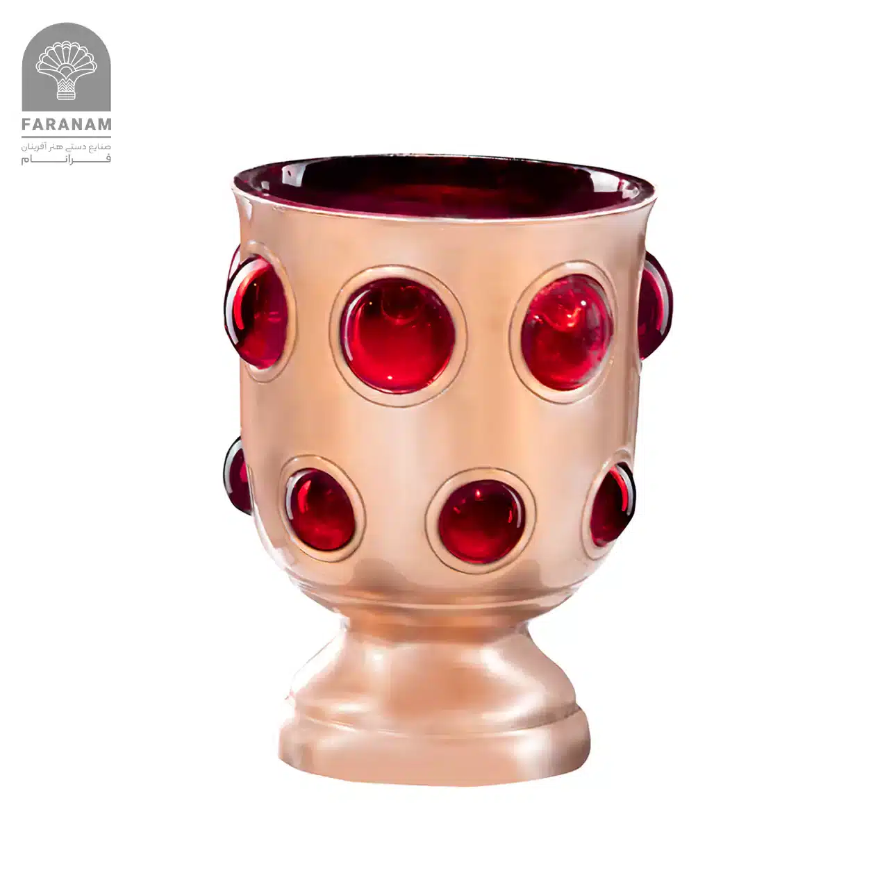ظرف مس و شیشه فرانام تهیه شده از با کیفیت ترین مس میباشد که پس از طی کردن مرحله خم کاری و شبکه بری با هنر قلمزنی و شیشه گری تزریقی مزین شده است و ترکیبی تکرار نشدنی به بیننده ارائه می نماید و پوشش پلی استری آن مانع از ایجاد هرگونه تغییر رنگ و آسیب سطحی می شود که ماندگاری این اثر هنری و ارزشمند را تضمین میکند.
