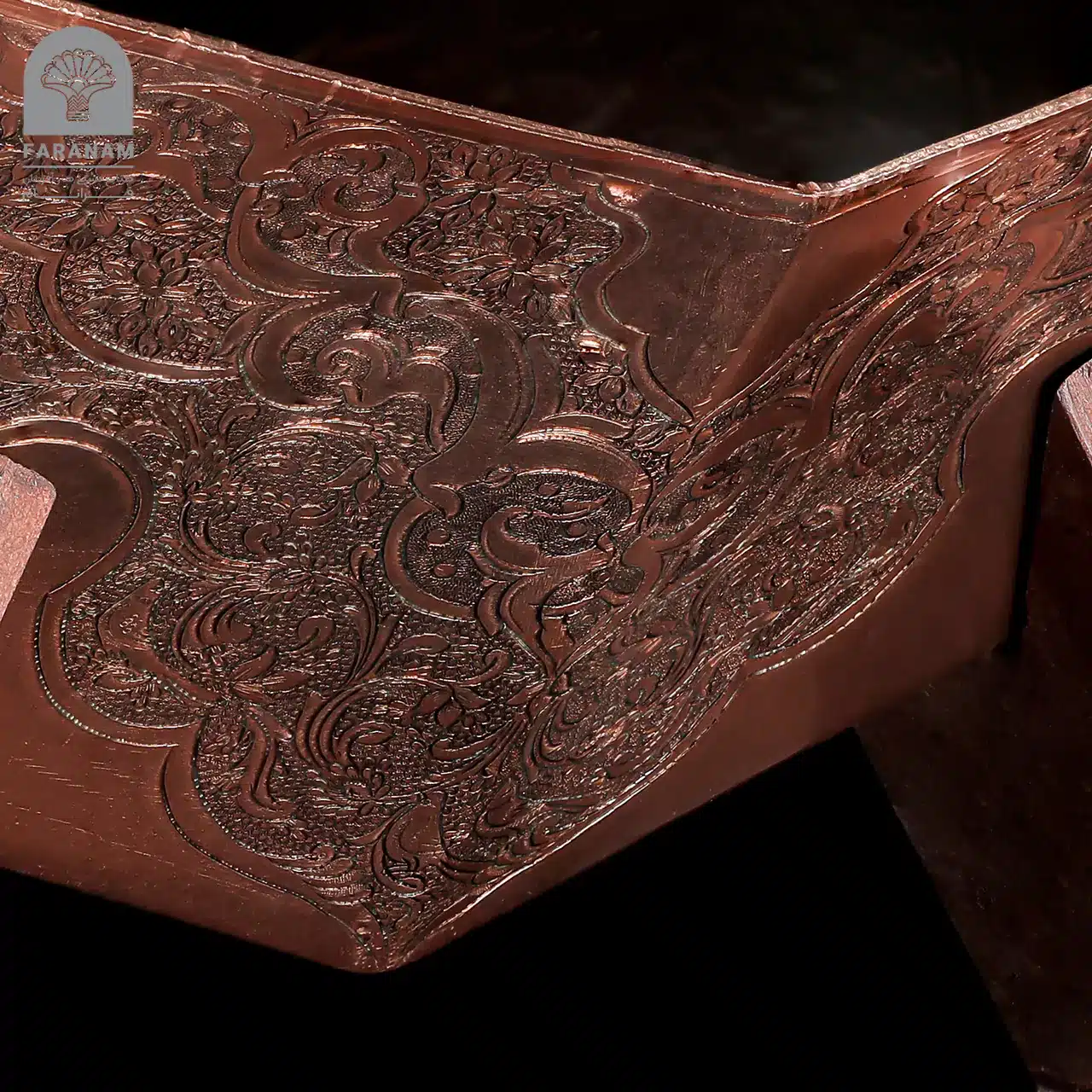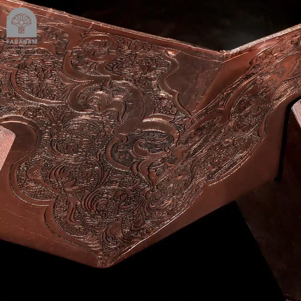 انرژی نهفته در مس و نقوش سنتی نقش بسته با هنر قلمزنی ترکیبی تکرار نشدنی به بیننده ارائه می نماید. پوشش پلی استری آوند فرانام از تغییر رنگ و آسیب سطحی آن جلوگیری کرده و ماندگاری و زیبایی آن را تضمین میکند.