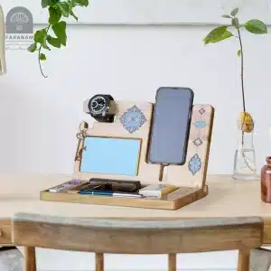 استندهای نظم دهنده فرانام از چوب رابروود خالص میباشد که با ابعاد 21.30.4 و وزن تقریبی 1104 گرم با هنر زیبا و فاخر صنایع دستی اعم از خاتم، تذهیب و گل و مرغ مزین شده است. این استند ها ضمن حفظ امنیت بیشتر برای تلفن همراه به عنوان یکی از با ارزش ترین محصولاتی که به جهت تکنولوژی تمامی اطلاعات شخصی نیز در آن نگهداری میشود؛ آرامش ذهنی را با ارائه فضایی مناسب برای نگهداری ساعت، عینک، کلید،خودکار و دفترچه یادداشت و ایجاد نظم محیط پیرامون و میز کار به ارمغان می آورد.